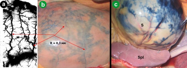Figure 2. a. Contrast X-ray examination of the submucosal arterial network of a removed stomach (P: main anastomotic channels; S: subsidiary anastomotic channels; M: mucosal arteries). b. Staining of the submucosal arterial network of a cadaveric stomach at perfusion of the left gastric and right gastroepiploic arteries with methylene blue after all the arteries pertinent to the spleen except the short gastric arteries were ligated. The radius (R) of the “main anastomotic channels” is approximately 0.3 mm, which corresponds to [52]. c. The staining of gastric submucous arteries took place within 1-2 min. There was no staining of the spleen during a 20-min period. Figure 2a was published as Figure 5 in: Barlow TE, et al. Arteries, vein and arterio-venous anastomoses in the human stomach. Surg Gynecol Obstet 1951; 93:657-7 [52]. Copyright Elsevier, 1951. Published with permission of the publisher. |