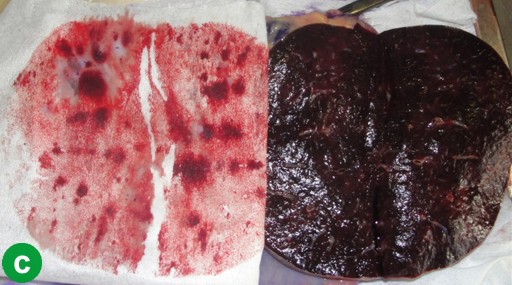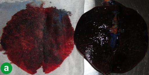 At perfusion of the stomach with methylene blue via the left gastric and right gastroepiploic arteries the submucosal gastric arterial network filled up in approximately one to two minutes, which then manifested itself with absorption of the stain in the entire stomach in 9 subjects and the staining of two-thirds of the stomach in one (Figure 2bc and Table 2). Three to five minutes after the perfusion was induced, swelling of the gastric wall was noticed, and the stain was noticed oozing through the mucosa into the gastric lumen. In the control groups the degree of staining of the stomach was immaterial. Within 20 minutes, the splenic pulp was intensely stained in 5 controls with the perfused splenic artery (control group A; 5 cases: +++; Figure 3a) and in all 5 controls not having the left gastroepiploic artery ligated (control group B; 3 cases: +++; 2 cases: ++; Figure 3b). With all the arteries other than the short gastric arteries being ligated, there was pronounced staining of the spleen in one case (++), observed small sporadic spots of staining (+) and no staining at all (0) (Figure 3c) in 2 and 7 cases, respectively (Table 2). In 2 cases, the branches of the short gastric arteries were seen to absorb the stain but the staining of the spleen did not take place (Cases #2 and #6).