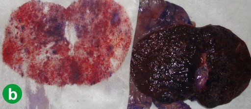 For the spleen imprints, the intensity of the staining was defined as 0 when there was no staining at all, + if there were 1-3 small foci of methylene blue, ++ if multiple focuses were seen and +++ if there was pronounced diffuse staining of the surface. For the stomach, the staining of 1/3 of its surface was classified as +, staining of 2/3s as ++ and staining of the entire stomach as +++.
