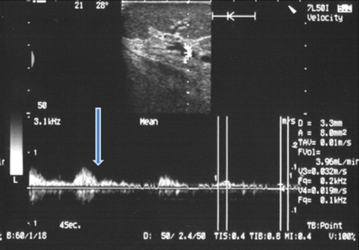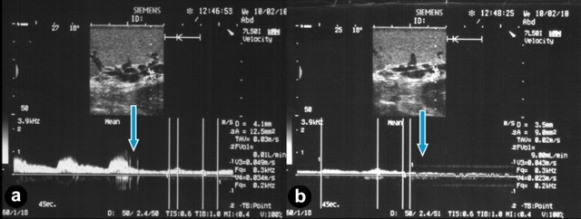 Figure 4. Intraoperative color Doppler ultrasound of the splenic hilum at distal pancreatectomy in cases of a direct anastomosis between the left and right gastroepiploic arteries. a. A 3-fold fall in blood flow volume after splenic artery cross-clamping (arrow). b. Upon the splenic artery being clamped the left gastroepiploic artery clamping (arrow) caused the arterial blood flow to cease. Upon the splenic artery being clamped, the clamping of the short gastric arteries before or after left gastroepiploic artery cross-clamping did not alter the flow parameters. |