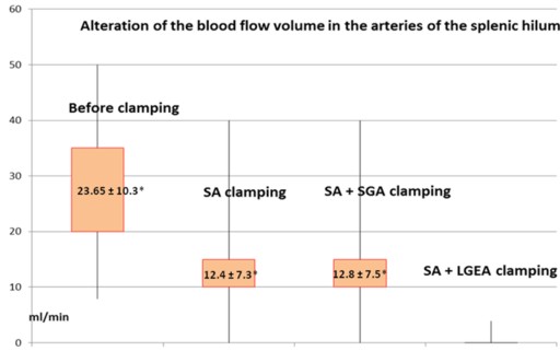 After 23 distal pancreatectomies (6 males, 17 females; age mean±SD: 50.9±11.9 years), intraoperative evaluation of the arterial blood flow in the splenic hilum was carried out by intraoperative color Doppler ultrasound. Eight out of the 23 procedures were extended corporocaudal distal pancreatectomies for pancreatic cancer and 15 were standard distal pancreatectomies for chronic pancreatitis (n=2) and for cystic (n=9) or neuroendocrine tumors (n=4). In all cases, CT and CT angiography had shown normal (Michels type I) celiaco-mesenterial arterial architecture previous to surgery and, in three cases, the gastroepiploic arcade was not locked (there was not an immediate anastomosis between the left gastroepiploic artery and the right gastroepiploic artery). Laparotomy was performed using the L-shaped approach in all of the patients. The mean systolic velocity and blood flow volume were gauged on one of the terminal branches of the splenic artery in the vicinity of the splenic hilum distally to the site of origin of the left gastroepiploic artery. The tail and body of the pancreas were totally severed from the surrounding tissues, the gland was cut across in the region of the body or neck (as required by the extent of morbid involvement) with the splenic, short gastric and left gastroepiploic arteries being left intact. The transection of the gland precluded any chance of blood supply to the spleen through the transverse pancreatic artery, normally running within the parenchyma of the body of the pancreas and anastomosing with the arteria pancreatica magna. The measurements were made, while waiting for frozen-section biopsy findings, through the splenic parenchyma with a transducer placed on its diaphragmatic surface and beamed along its longitudinal axis: 1) after clamping the splenic artery alone, 2) clamping the splenic and left gastroepiploic arteries and 3) clamping the splenic and short gastric arteries. Subsequent to declamping the left gastroepiploic artery and short gastric arteries, evaluation was carried out again with a clamp across the splenic artery, the short gastric arteries and the left gastroepiploic artery which were clamped in succession. The spleen was recognized as viable when its color and hilar arterial blood flow remained normal, as determined by intraoperative color Doppler ultrasound. The span of evaluation was 5 min from the clamping of the next artery in turn.
