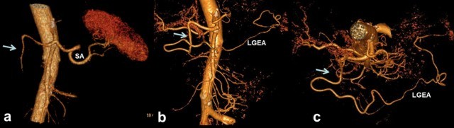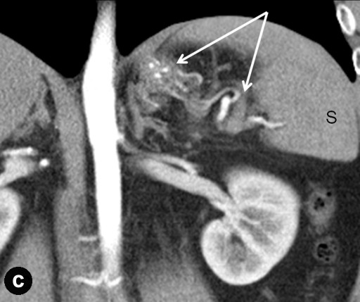 Figure 11. Celiaco-mesenterial arterial anatomy in a 34-year-old man 9 years after a spleen-preserving distal pancreatectomy with resection of the splenic vessels for a neuroendocrine carcinoma. a. 3D CT angiography (after the renal artery images were eliminated) showing the collateral blood flow through the inferior branch of the left gastric artery (arrowhead) anastomosing with the short gastric arteries and/or the branches of the left gastroepiploic artery (thin arrow) with the gastroepiploic arcade being broken (thick arrow). b. and c. CT: arterial phase. Delineated elongation, coiling, tortuousness and dilation of the perigastric arteries and veins (arrows) are seen against the background of a thickened gastric wall and splenomegaly. S: spleen; SAR: splenic artery remnant |