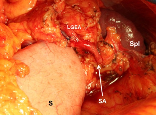 Figure 10. View of the operating field after a spleen-sparing distal pancreatectomy with resection of the splenic vessels. The left gastroepiploic artery is of the same diameter as the terminal portion of the splenic artery (arrow). LGEA: left gastroepiploic artery; S: stomach; SA: splenic artery’s terminal portion; Spl: spleen |