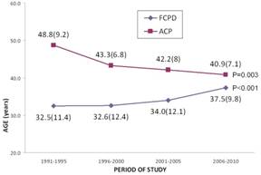 Figure 1 shows that there was a progressive increase in age at diagnosis of FCPD patients during the period of study (P<0.001) while there was a decrease in age at diagnosis of diabetes secondary to ACP (P=0.003).