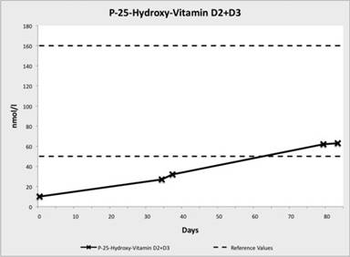 Figure 1. Plasma values of 25-hydroxy vitamin D2+D3 for a patient with severe impaired walking function due to pancreatic insufficiency. The initial plasma 25-hydroxy vitamin D2+D3 value was found to be less than 10 nmol/L. Treatment with monthly i.m. injections of 300,000 IU of ergocalciferol was initiated at day 15. Levels steadily rose and were found to be within the reference levels at day 79. |