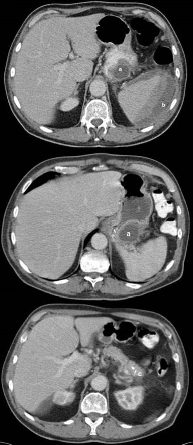 Figure 1. Initial CT scan on admission showing a large pseudocyst (a.) measuring (37x33 mm) within the pancreatic tail, associated subcapsular splenic haemorrhage (b.) measuring (96x55 mm) and calcification in the pancreatic body (c.) |