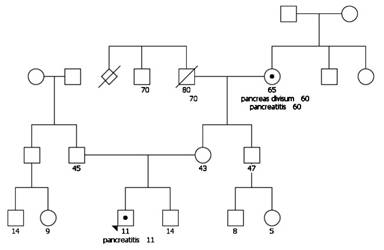 The proband was an 11-year-old male with a history of recurrent pancreatitis and episodes of severe abdominal pain with periods of narcotic dependency. The patient initially presented with abdominal pain at age 5 lasting 3-4 days. At that time, the symptoms were thought to be associated with “emotional issues” relating to a death in the family and other social family issues. Pancreatitis was first diagnosed at age 10. The nutritional status was within normal limits for expected height and growth for age. Albumen and associated laboratory values were within normal limits.