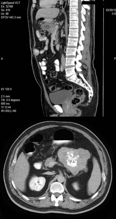 Solid pseudopapillary tumors of the pancreas constitute approximately 1-2% of all exocrine pancreatic tumors [1]. They are rare, and occurs most frequently in young women (90%) [2]. It consists of an indolent group of epithelial neoplasms which frequently undergo hemorrhagic necrosis and subsequent cyst formation [3]. They rarely cause symptoms, and can be located anywhere in the pancreas [4]. Solid pseudopapillary tumors are usually discovered incidentally on computed tomography (CT) or magnetic resonance imaging (MRI) scans and the recommended treatment is a surgical resection because they have a malignant potential [2, 5]. Although solid pseudopapillary tumor is considered an indolent lesion with a low malignant potential and a favorable prognosis after surgical resection, some cases of locally infiltrating and metastatic variety, or recurrences after surgery, have been reported. The occurrence of infiltrating varieties of solid pseudopapillary tumor is very rare [6]. We report a male patient with a locally advanced solid pseudopapillary tumor who underwent distal pancreatectomy, splenectomy and segmentally transverse colon resection. A literature review of infiltrating solid pseudopapillary tumors allowed us to find a little number of patients with locally advanced solid pseudopapillary tumor and few cases with male gender.