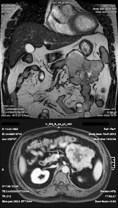No adjuvant therapy was given. Follow-up included clinical examination, routine laboratory tests, and abdominal MRI. Eleven months after surgery, abdominal MRI showed no signs of disease relapse. The patient was alive and symptom free at the time we wrote this paper.