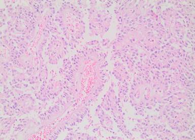 Figure 3. Microscopic findings of solid-pseudopapillary neoplasm on our biopsy specimen showing prominent pseudopapillary growth pattern (Hematoxylin and eosin, 20x high power field). |