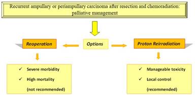 Proton reirradiation seems to have a role in the management of locally recurrent ampullary or pancreatic adenocarcinoma after resection and chemoradiation according to a study by Plastaras et al. The eligible patients with locally recurrent disease were 10 and underwent proton reirradiation (median total dose 50.4 Gy). Among them, a total of 9 patients also received concurrent chemotherapy with 5-fluororacil or capecitabine-based chemotherapy. The aim of the study was to examine the toxicity and the ability of local control. The follow up lasted 8.2 months. The toxicity profile was manageable with grade 1 or less non-hematological RT-related toxicity and mainly grade 1 hematological toxicity. Furthermore, the majority of the patients (80%) did not develop progressive disease within the retreated fields, revealing the potential role of reirradiation concerning the local control. Half of the patients developed metastatic disease with a median progression free survival of 7.4 months after starting radiotherapy and only one patient died during the period of the follow up.