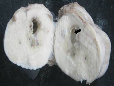 Figure 2. Pancreatic tail mass (10.0x8.8x7.5 cm) with distal pancreatectomy and splenectomy specimen revealed non-encapsulated tumor with cyst formation (arrow) and areas of whorling on cut surface. |