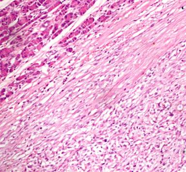 Figure 3. Section showed tumor composed of sheets of spindle shaped cells with bland nuclear morphology, fine chromatin, inconspicuous nucleoli and mild cytoplasm along with adjacent normal pancreas (H&E x40 magnification). |