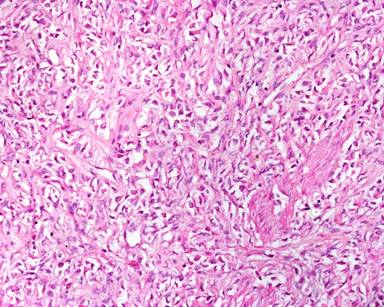 Figure 4. Section showed sheets of spindle shaped cells with bland nuclear morphology, fine chromatin, inconspicuous nucleoli and mild cytoplasm (H&E x40 magnification). |