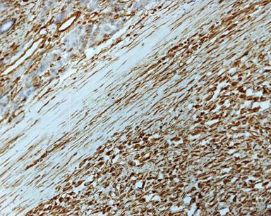 Figure 6. Tumor cells are strongly positive for vimentin immunostaining (x40 magnification). |