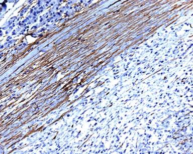 Figure 8. Tumor cells are negative for smooth muscle actin (SMA) immunostaining (x40 magnification). |