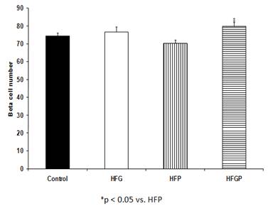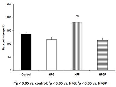 There were no changes in beta cell morphology in HFL and HFGL weanlings compared to control weanlings (data not shown). HFP adolescents displayed beta cell hypoplasia compared to HFGP adolescents (Figure 1A) and beta cell hypertrophy compared to control, HFG and HFGP adolescents (Figure 1B). Beta cell volume was similar amongst the groups (Figure 1C).
