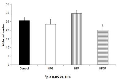 There were no changes in alpha cell morphology in HFL and HFGL weanlings compared to control weanlings (data not shown). HFP adolescents displayed alpha cell hyperplasia relative to HFGP adolescents (Figure 2A). Alpha cell sizes (Figure 2B) and volumes (Figure 2C) were similar amongst the groups.