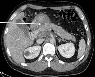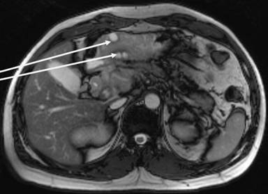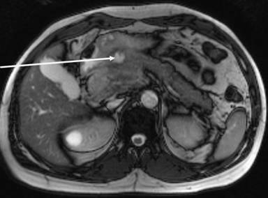 Figure 3. MRI showing a posterior lesion penetrating into the pancreas (arrow). |