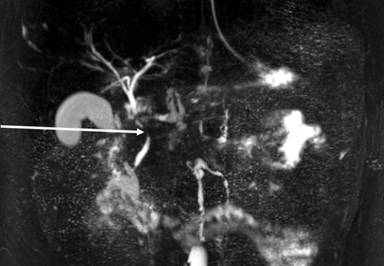 Figure 4. MRI showing main biliary duct narrowed by venous network called portal cavernoma (arrow). |
