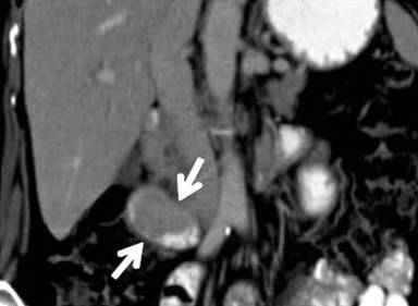 Figure 1. Computed tomography obtained with oral and intravenous contrast material: coronal reformation image. An enhancing, well-marginated 5.5-cm soft-tissue intraluminal mass (arrows) is seen in the second portion of the duodenum extending to the ampullary region without obstruction. |