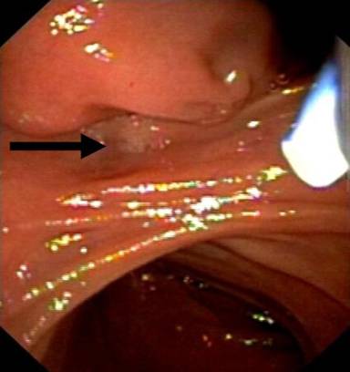 Figure 3. Distal view of the tumor. The opening of the papilla (arrow) lies outside of the submucosal tumor. |