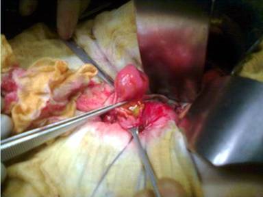 Figure 4. Α polypoid mass in the second portion (periampullary) of the duodenum: intraoperative aspect. |
