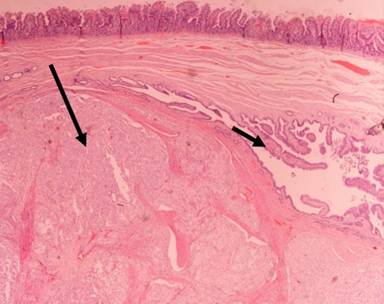 Figure 5. Low power view of the tumor located predominantly in the submucosa, with expansile and non-invading border (H&E, x20; long arrow: tumor; short arrow: region of the ampulla of Vater). |