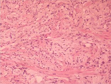 Figure 6. Spindle–shaped cells with intermingled ganglion cells (H&E, x200). |