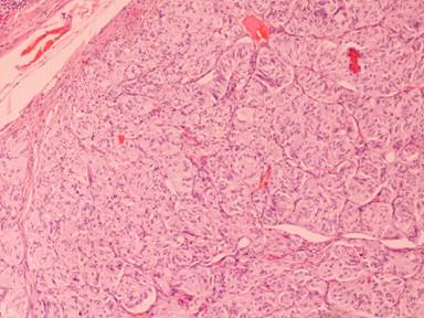 Figure 7. Epithelioid cells arranged in alveolar, trabecular or rosettes formations (H&E, x200). |