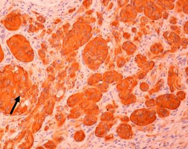 Figure 8. On immunohistochemical staining, epithelioid cells were positive for chromogranin A, while spindle and ganglion cells were negative (arrow: epithelioid cells). |