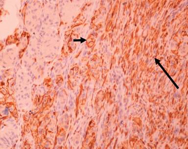Figure 9. Immunohistochemistry for S-100 protein expression detection. Spindle-shaped cells and ganglion-like cells were positive, while epithelioid cells were negative (short arrow : ganglion-like cells; long arrow: spindle-shaped cells). |