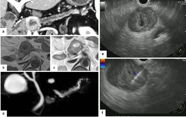 Figure 1. Findings of image examinations. Curved planar reformation of computed tomography made by tracing the main pancreatic duct showed a well-defined mass of the pancreas with strong enhancement, stenosis of the main pancreatic duct, and central cystic change (a.). Magnetic resonance imaging showed an iso-intensity mass with a central cystic portion and capsule like rim on (b., c.). MR cholangiopancreatography clearly showed cystic degeneration in the central portion of the mass and pancreatic duct stenosis due to the mass (d.). Endoscopic ultrasound demonstrated a well-demarcated hypoechoic mass with a central hyperechoic area, which indicated intratumoral hemorrhage or degeneration (e.). Fine needle aspiration was performed using a 22-gauge needle (f.). |