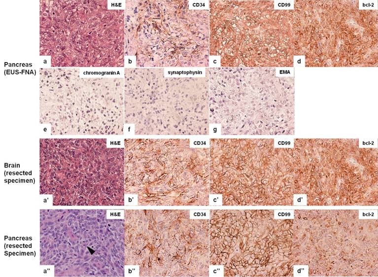 Figure 2. Histological findings and immunohistochemical profiles (400×). H&E staining of the EUS-FNA specimen showed presence of elongated cells containing oval or spindle shaped nuclei in a “patternless pattern” in EUS-FNA, surgically resected brain, and pancreatic specimen (a, a’, a’’). The atypical feature of high mitotic rate (>4 mitoses/10 HPF) was found only in the resected pancreatic specimen (high magnification images of the boxed area from a’’). Immunohistochemical profile of the EUS-FNA specimen demonstrated CD34, CD99, and bcl-2 positivity (b, c, d), but chromogranin A, synaptophysin, and EMA negativity (e, f, g,), which were identical in the surgically resected brain and pancreatic specimen (b’, c’, d’, b’’, c’’, d’’). |