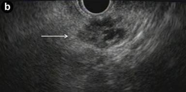 Figure 1. a. CT image of pancreatic dermoid cyst (white arrow) demonstrating a well-circumscribed, hypodense lesion. b. EUS revealed a complex cyst (white arrow) in the tail of the pancreas. |