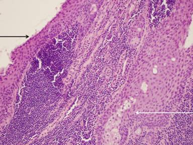 Figure 3. Photomicrograph of H&E stain at 20x magnification showing stratified squamous epithelium (black arrow), sebaceous units (white arrow), and surrounding lymphocyte infiltration. |