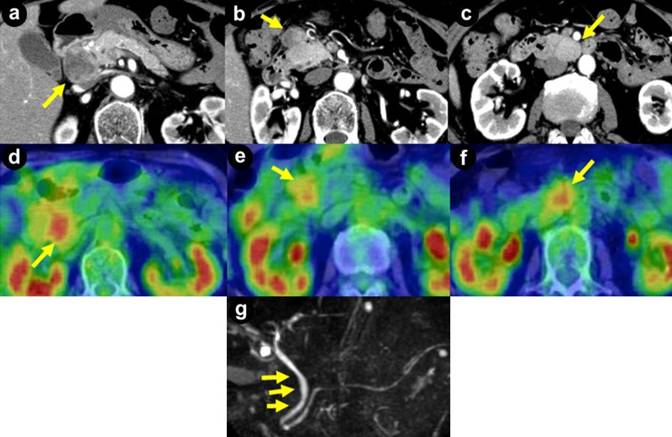 Figure 1. Enhanced computed tomography showed a low-density mass measuring 37 mm in diameter in the head of the pancreas (a.) and enlarged lymph nodes on the anterior surface of the pancreatic head (b.) and the posterior surface of the horizontal part of the duodenum (c.), measuring 28 mm and 34 mm in diameter, respectively. 18F-fluorodeoxy-glucose positron emission tomography showed increased uptake in all three lesions, with a maximum standardized uptake value ranging 3–4 (d. e. and f.). Magnetic resonance cholangiopancreatography showed that the middle portion of the common bile duct was shifted to the left by the tumor in the head of the pancreas (g.). |