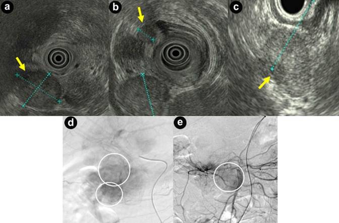 Figure 2. Endoscopic ultrasonography showed a hypoechoic mass measuring 37×30 mm in the head of the pancreas (a.) and two hypoechoic masses adjacent to the head of the pancreas (b. and c.). Selective angiography showed two hypervascular tumors in the head of the pancreas supplied by the gastroduodenal artery (d.), and a third tumor supplied by the inferior pancreaticoduodenal artery (e.). |