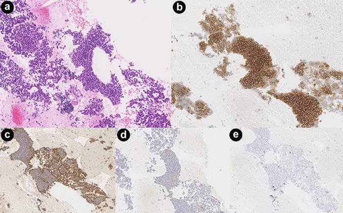 Figure 3. Examination of the biopsy specimen obtained by endoscopic ultrasound-guided fine needle aspiration showed a proliferation of almost uniform polygonal cells with hyperchromatic round nuclei and eosinophilic fine granular cytoplasm, arranged in alveolar nests, sheets, or partial rosette-like patterns (a.). Immunohistochemical staining showed that many tumor cells were positive for somatostatin (b.), synaptophysin (c.), and chromogranin A (d.). The MIB-1 labeling index was less than 5% (e.). |
