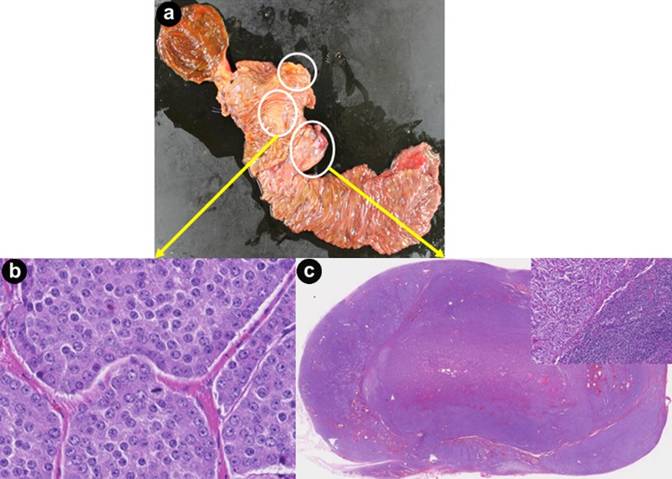 Figure 4. a. Schematic representation of the locations of the pancreatic somatostatinoma and lymph node metastases. b. Pathological examination of the resected specimen showed poorly defined nodular lesions in the pancreatic head (hematoxylin and eosin staining, magnification ×200). c. Two lymph nodes adjacent to the pancreas contained metastatic tumor cells (hematoxylin and eosin staining, magnification ×100). |