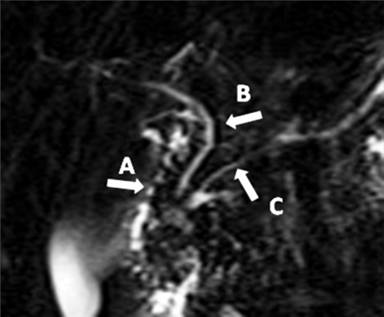 Figure 1. Magnetic resonance cholangiopancreatography (MRCP) image of the patient. By MRCP scan the diagnosis of chronic pancreatitis probably on the basis of pancreas divisum was suspected, but it was ruled out later by endoscopic retrograde cholangiopancreatography. A: duodenum; B: common bile duct; C: pancreatic duct |