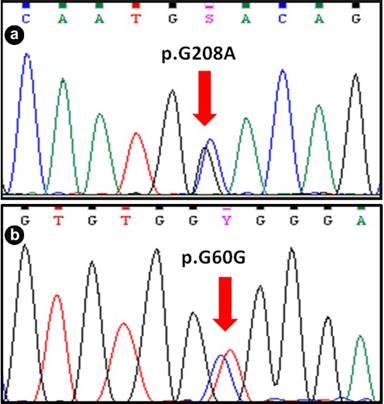 Figure 2. Sequence chromatograms of p.G208A mutation of cationic trypsinogen gene (PRSS1) (a.) and p.G60G mutation of chymotrypsin C gene (CTRC) (b.), both in heterozygous state. |