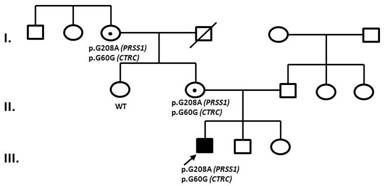 Figure 3. Pedigree of the family. Heterozygous carriers of the p.G208A mutation of cationic trypsinogen gene (PRSS1) and p.G60G mutation of chymotrypsin C gene (CTRC) are indicated. Subjects affected with chronic pancreatitis are shown by solid black symbols. The arrow points to the index patient. The central black dot signifies clinically healthy carriers of the p.G208A mutation of PRSS1 and p.G60G mutation of CTRC. Crossed symbols designate deceased family members. WT: wild type |