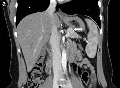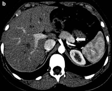 Figure 1. Coronal (a.) and transverse (b.) views of abdominal contrast-enhanced computed tomography scans: showing a 10x12x17 mm, small, well-demarcated, heterogeneously enhancing lesion within the body of pancreas (white arrow) without dilatation of pancreatic duct. No evidence of lymphadenopathy or distant metastasis was identified. |