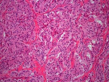 Figure 2. Microscopic examination of the resected pancreatic mass showing that the tumor cells were organized in solid trabeculae or nests separated by fibrovascular stroma (magnification power, 20x). |