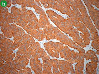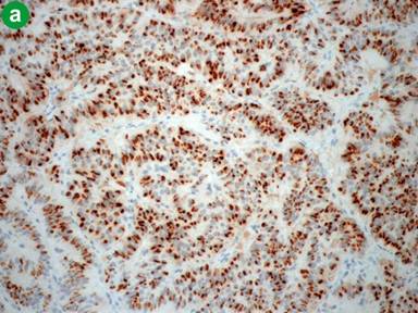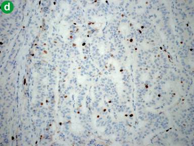 Figure 3. Immunohistochemical examination of the resected pancreatic mass (magnification power, 40x). a. Tumor cells stained positive for chromogranin A. b. Tumor cells stained positive for synaptophysin. c. Tumor cells stained positive for insulin. d. Tumor cells stained positive for Ki-67 (6%). |