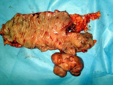 Figure 2. On cut section, pedunculated polypoidal mass arising from the splenic flexure of colon. |