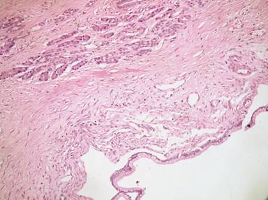On macroscopic examination the mucosal surface of the colon showed a pedunculated polypoid growth measuring 6x5x2 cm. Outer surface of growth was bosselated and smooth. Cut section of growth showed multi-loculated cystic areas filled with mucin separated by solid areas. Histology (Figure 3). showed mucosal granulation tissue and growth composed of cysts lined by columnar mucinous epithelium with basal mildly anisomorphic round to oval nuclei and abundant pale cytoplasm with apical mucin. At places the cysts showed small papillary projections in the lining epithelium displaying low to high-grade dysplasia with loss of polarity. The sub-epithelial spindle cells stroma was ovarian-like, dense and cellular. The stalk and base of the tumor showed ectopic pancreatic tissue composed of pancreatic acini, islet cells and ducts. No invasive tumor was present. Intra-operative biopsy from the desmoplastic tissue showed fibro-adipose tissue, no evidence of malignancy was noted.