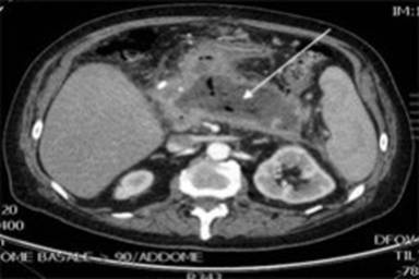An abdominal CT scan revealed a necrotic infarction of the body and tail of the pancreas with a collection (16 cm x 9 cm) of fluid and gas bubbles both in the peripancreatic area and bilaterally in the context of the Gerota's fascia. This collection determined a gastric compression.