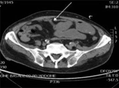 Three months later the patient was admitted to our Department with anorexia and repeated episodes of vomiting. A contrast-enhanced abdominal CT scan showed a voluminous pancreatic pseudocyst [1] occluding the stomach lumen and a pylethrombosis (Figure 1).